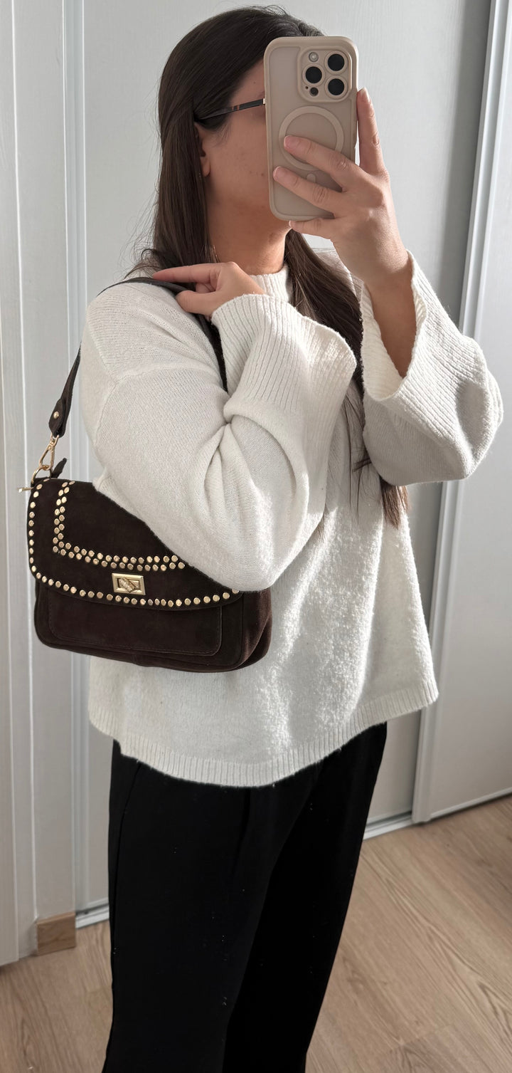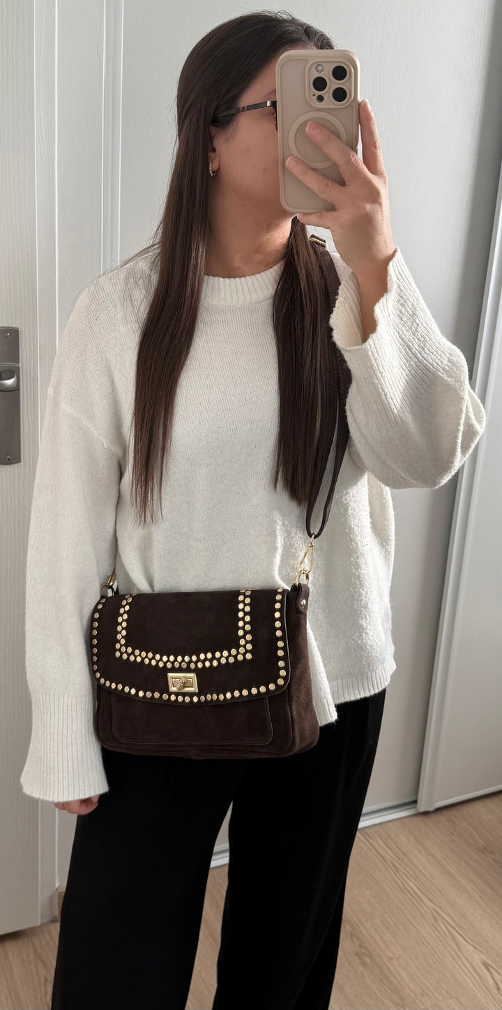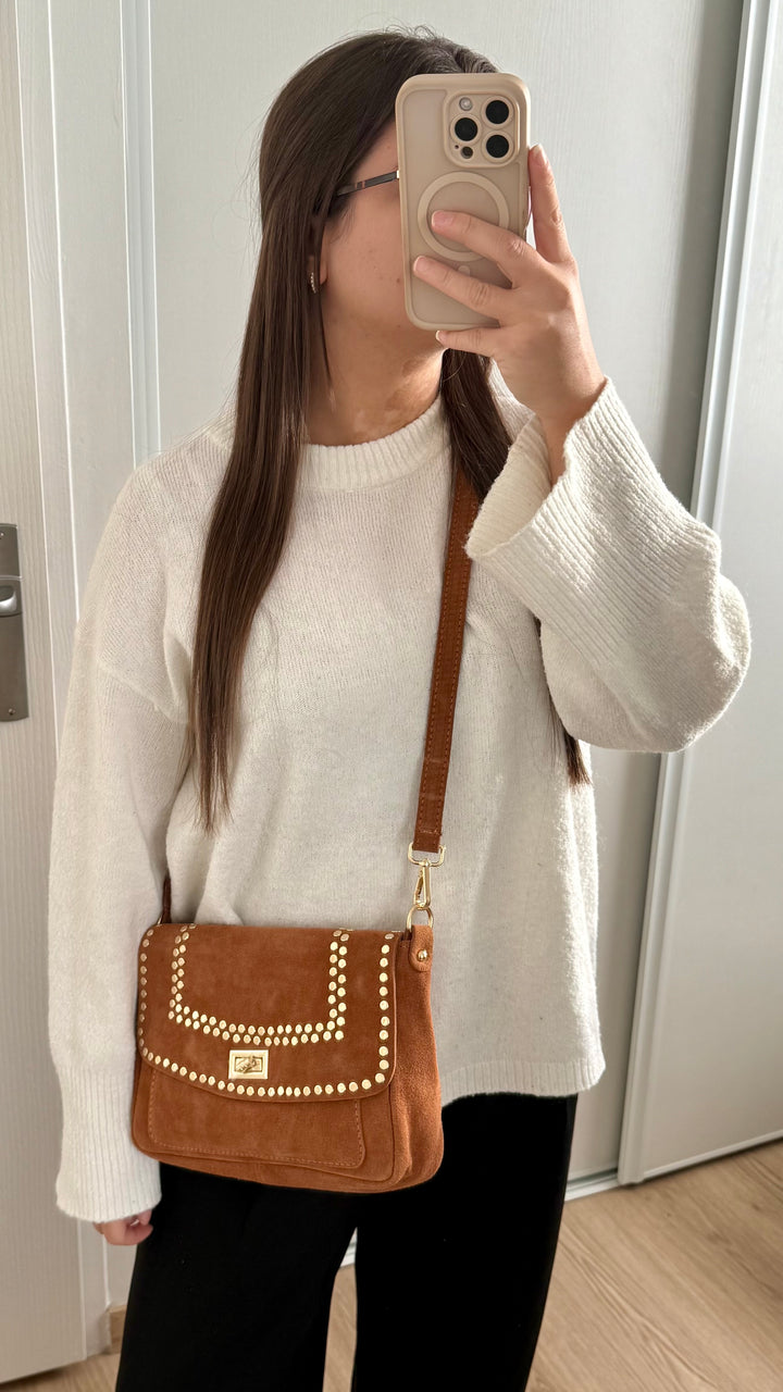 Le sac ELENA allie élégance et polyvalence avec son design deux-en-un. Confectionné en cuir suède doux, il se porte aussi bien à l'épaule qu'en bandoulière selon vos envies. Les sequins dorés apportent une touche de glamour subtile qui transforme ce sac en accessoire incontournable pour vos sorties. Pratique et raffiné, ELENA accompagne vos journées avec style et sophistication.