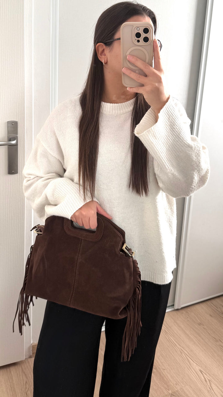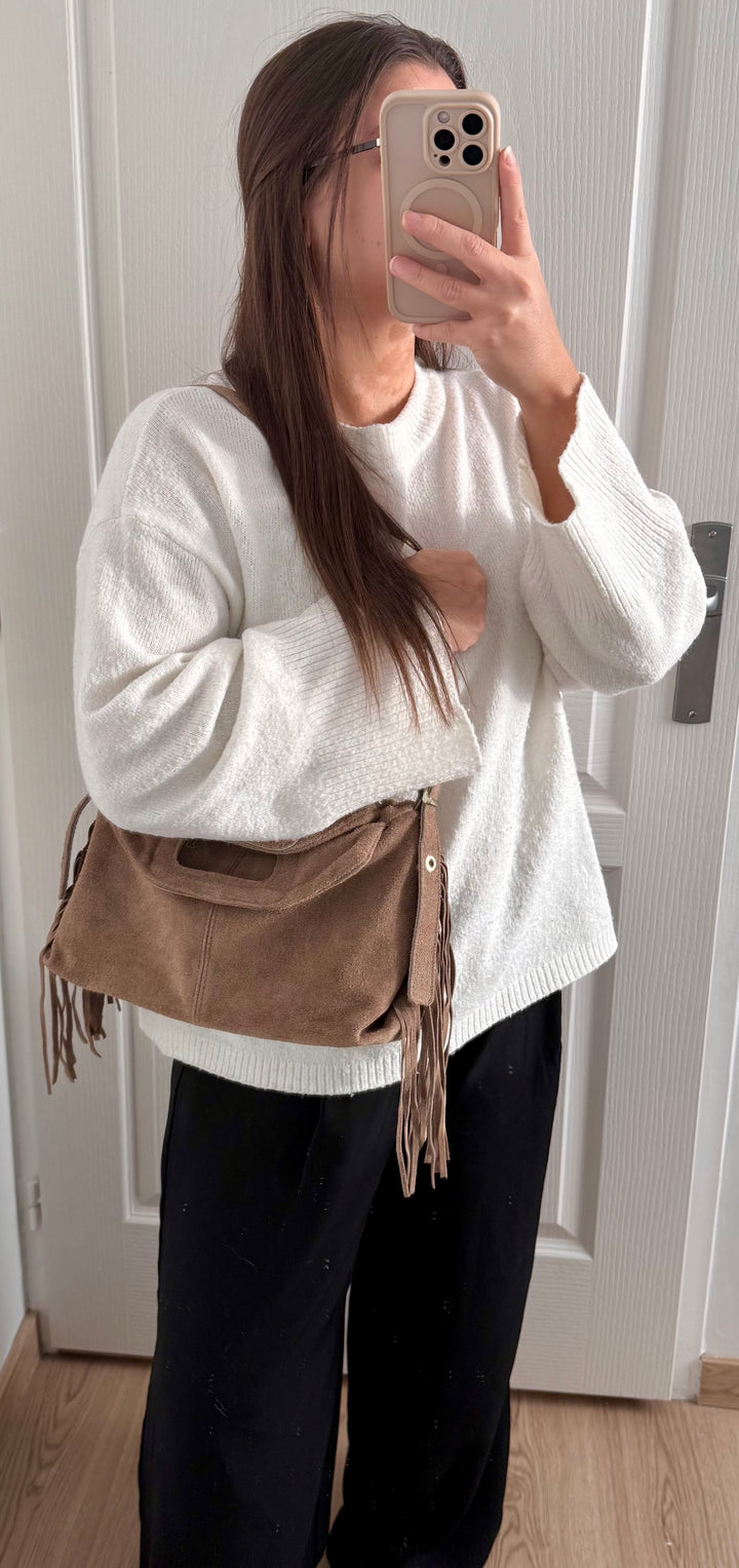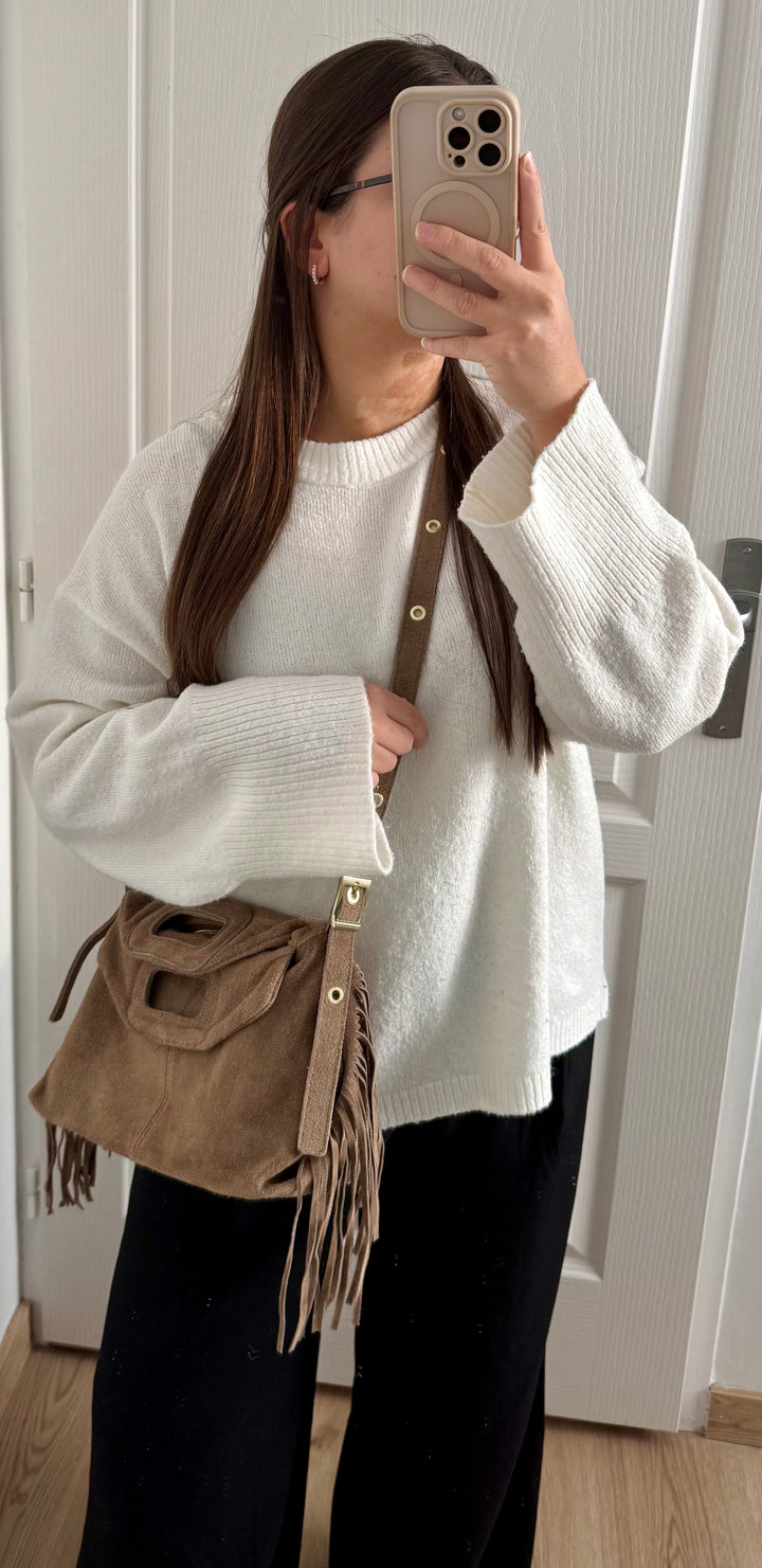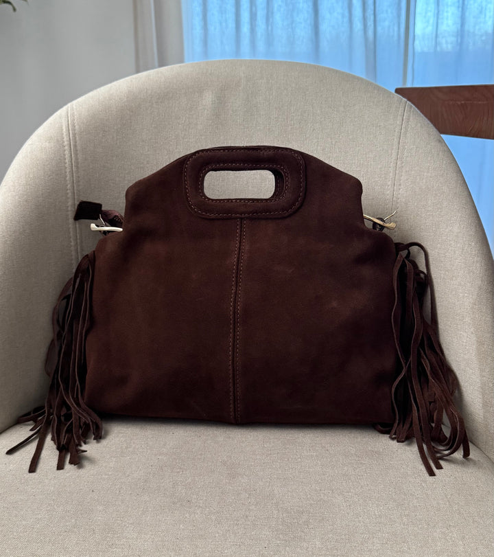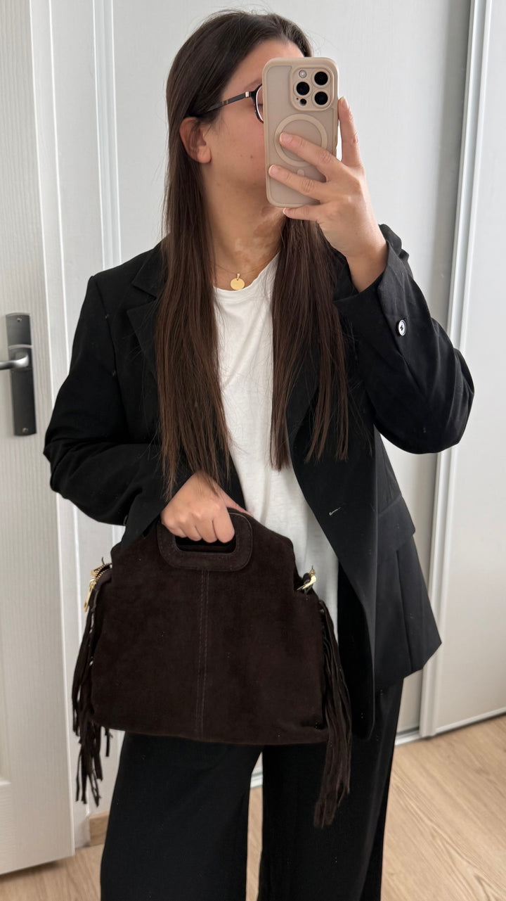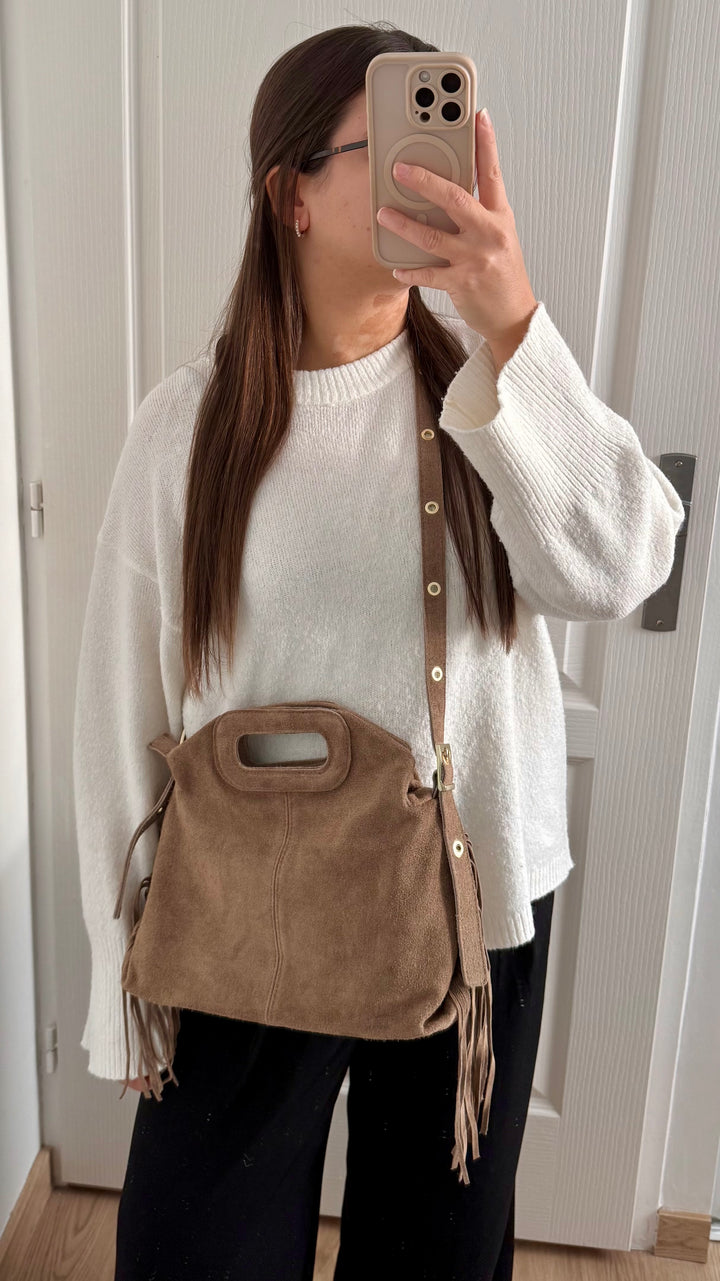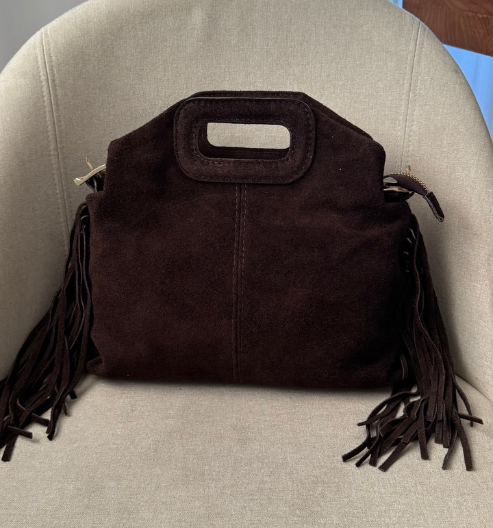 Découvrez le sac MIA, votre compagnon idéal pour chaque jour. Confectionné en cuir suède doux et raffiné, ce sac à bandoulière arbore des franges élégantes qui ajoutent une touche bohème à votre style. Portez-le en bandoulière, sur l'épaule ou à la main. Polyvalent et intemporel, le MIA s'adapte à tous vos besoins, du travail aux sorties entre amis. Un accessoire de qualité qui vous accompagnera longtemps avec élégance.