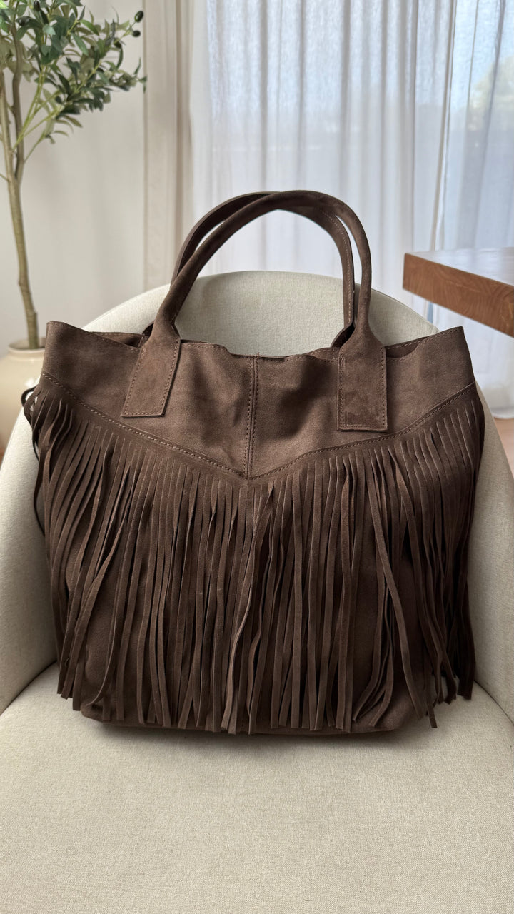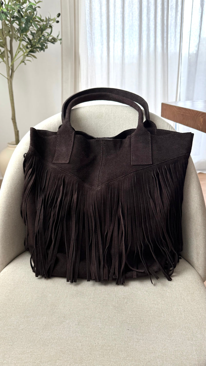 Découvrez le sac à main ARIA, un modèle porté épaule en cuir suédé souple orné de délicates franges. Son cuir doux assure un confort optimal tout au long de la journée, tandis que les franges apportent une touche d’élégance décontractée. Parfait pour allier style et praticité, ce sac accompagnera facilement toutes vos tenues, du quotidien aux sorties.