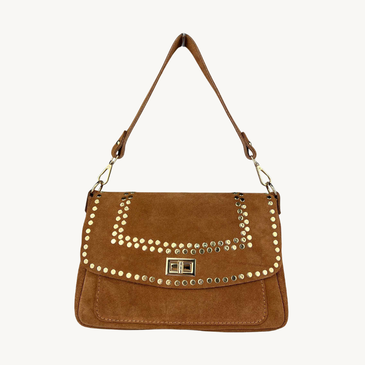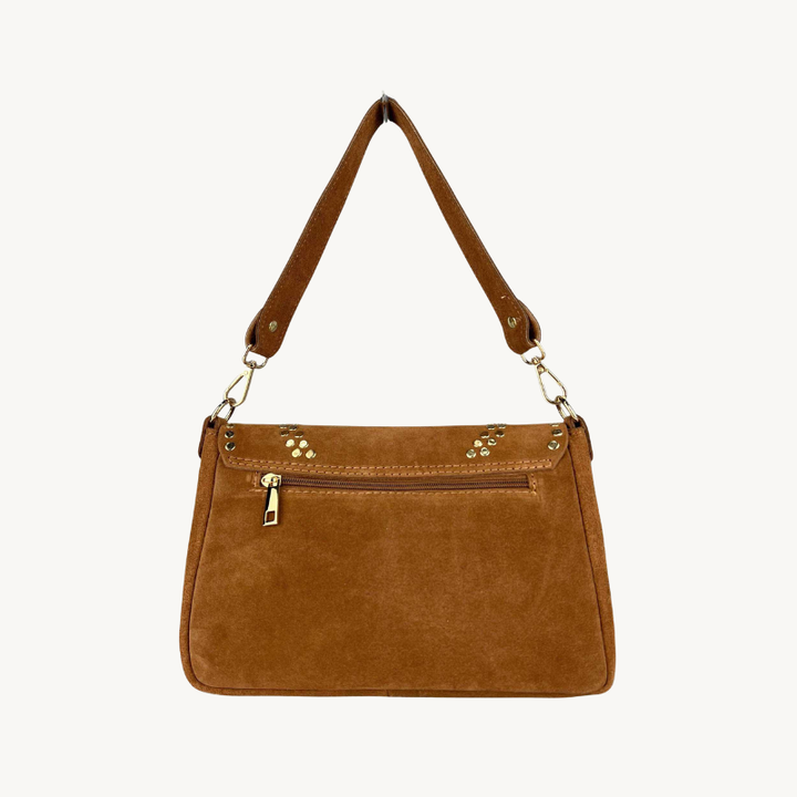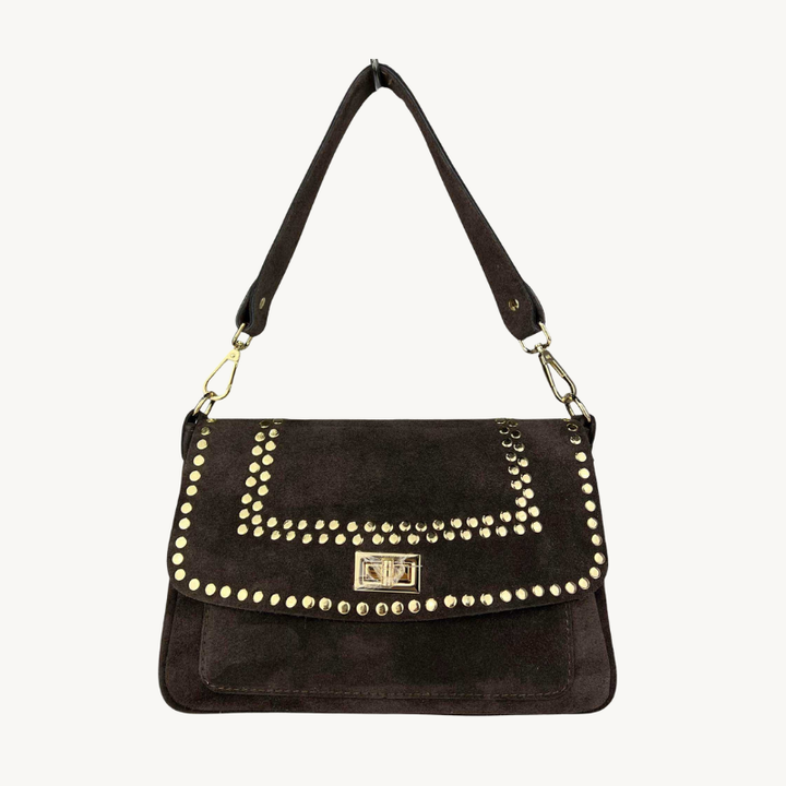 Le sac ELENA allie élégance et polyvalence avec son design deux-en-un. Confectionné en cuir suède doux, il se porte aussi bien à l'épaule qu'en bandoulière selon vos envies. Les sequins dorés apportent une touche de glamour subtile qui transforme ce sac en accessoire incontournable pour vos sorties. Pratique et raffiné, ELENA accompagne vos journées avec style et sophistication.