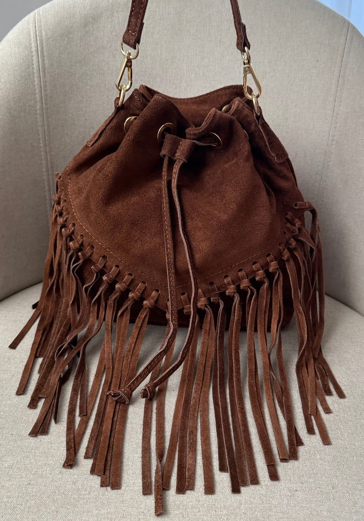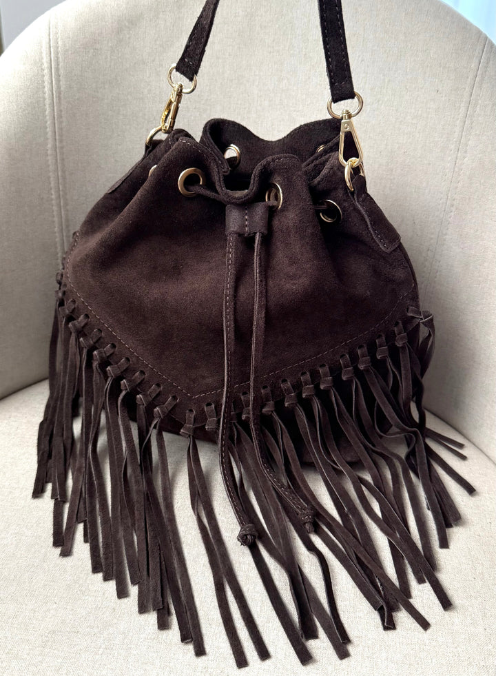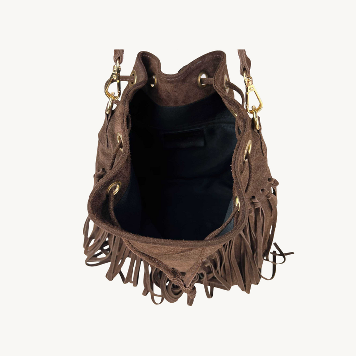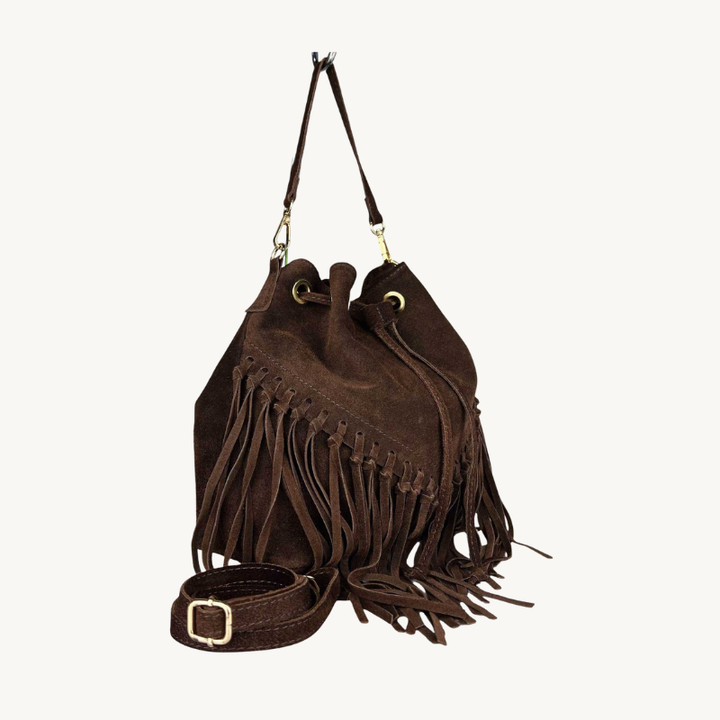 Découvrez MARIA, un sac à bandoulière et porté main confectionné en cuir suède doux. Ses franges délicates ajoutent une touche bohème et raffinée à votre silhouette. Pratique et sécurisé, le système de fermeture par cordon de serrage protège vos affaires au quotidien. Parfait pour accompagner vos journées, ce sac devient rapidement un incontournable de votre garde-robe.
